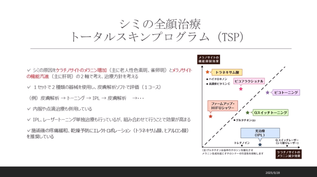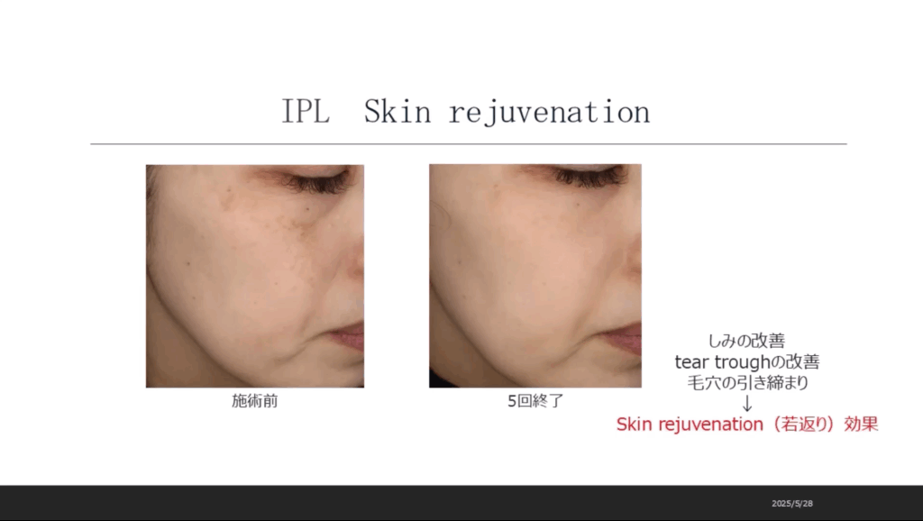 全顔のシミ治療において欠かせないのがIPLです。赤みや血管病変、ざ瘡後紅斑に対応できるほか、毛穴や小じわ改善といったスキンリジュビネーション効果も期待できます。当院では「赤み改善+美肌効果」の両立を実現し、解析ソフトによる数値・画像での可視化で信頼性を強化。さらに、全顔を対象とした「トータルスキンプログラム」を設計し、トーニング・IPL・CO₂レーザ・ピコレーザ、内服や点滴を組み合わせて高い満足度を提供。患者満足度と継続率を高め、経営面での安定性にもつなげています。
