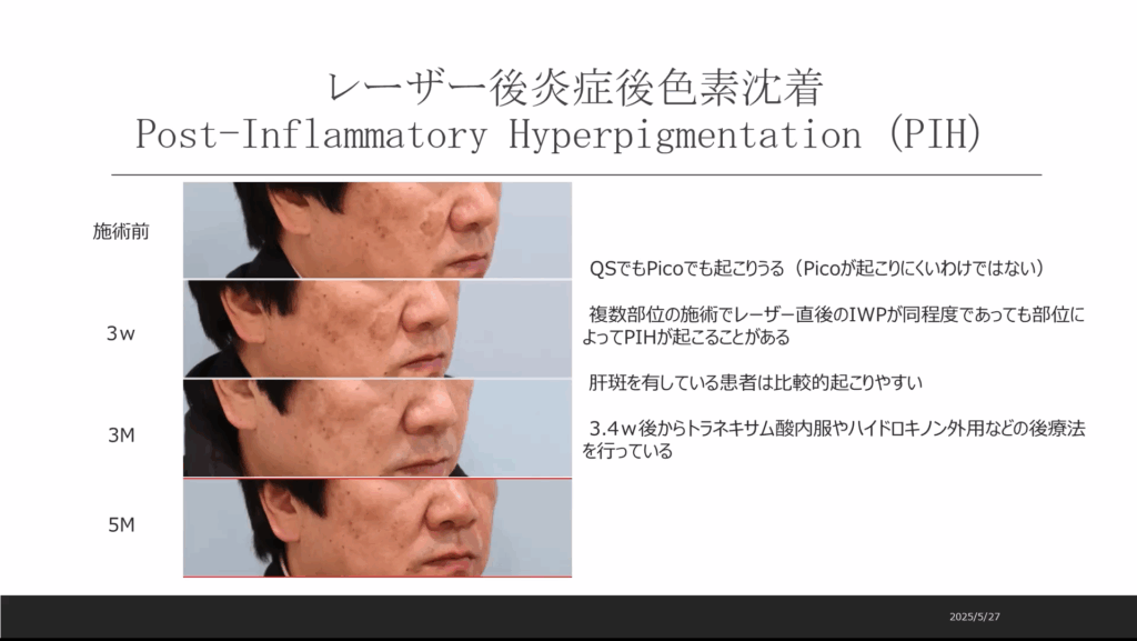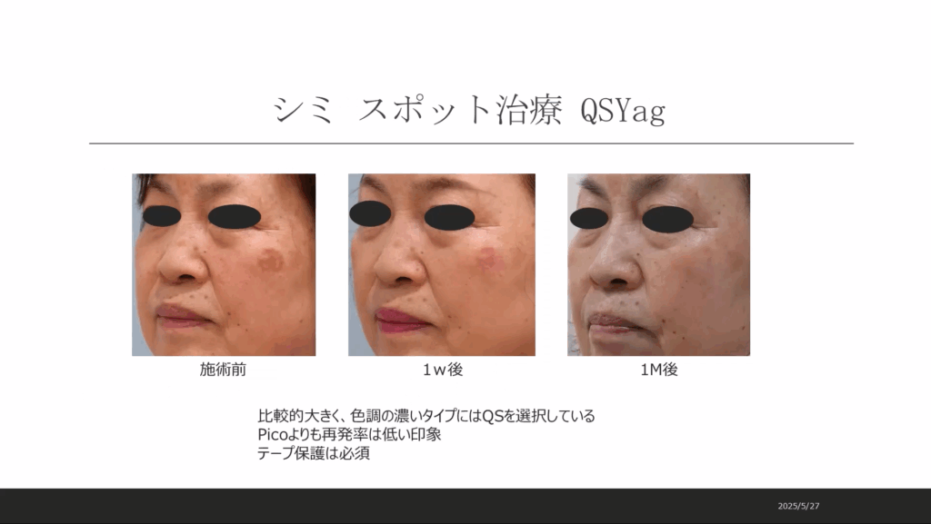 シミ治療におけるピコレーザとQスイッチヤグレーザの使い分けは重要です。ピコレーザが薄い色調や難治性のシミに適応しやすい一方で、Qスイッチは大きくはっきりとした色素斑に有効で、再発率も比較的低い印象です。ただし、炎症後色素沈着(PIH)は両機種ともにリスクがあるため、事前説明とフォローアップが欠かせません。当院では治療後3~4週間で必ず再診し、必要に応じてトラネキサム酸やハイドロキノンを組み合わせることで安全性と結果を担保しています。患者様が求める「目立たず、少ない回数で効果を実感できる」治療のためには機器の選択と使い分けが極めて重要です。