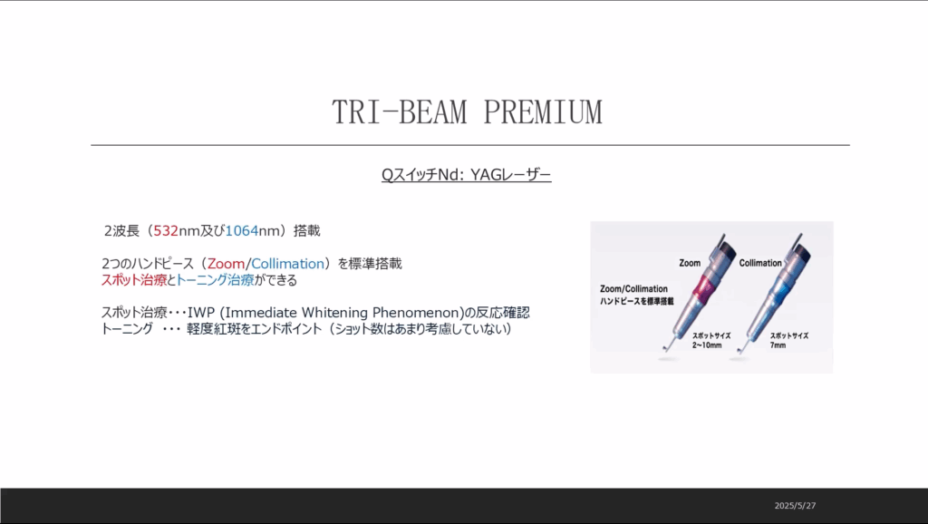 美容皮膚科領域におけるシミ治療は患者ニーズが高く、単一治療だけでは満足度が得にくいケースもあります。当院ではHIFU、CO₂レーザ、トライビーム PREMIUM(以下、トライビーム)、IPLなどを組み合わせ、真皮浅層から表皮にかけて多角的にアプローチ。特にHIFUシャワーによる肝斑改善や、トライビームの532nm/1064nm二波長を活かした精密なスポット照射・トーニングが特徴です。THモードやPTP機能を活用し、表皮ダメージを抑えながら高い効果を実現しています。