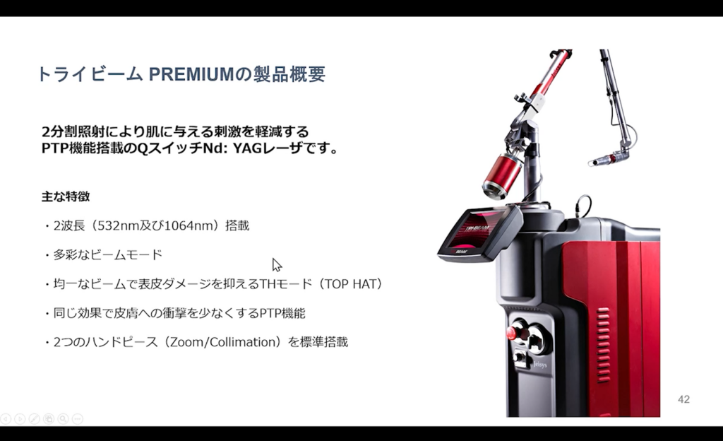 532 nmと1064 nmを搭載し、TOP HAT(TH) モード、Gaussian(G) モード、Gen(GN) モードを使い分けることで幅広い治療に対応できるQスイッチNd:YAGレーザー「TRI-BEAM PREMIUM」を題材に、機器を選択・活用する際にどのような点に着目すべきかを解説します。本ウェビナーは特定の治療法や使用方法を推奨するものではなく、レーザー治療を理解するための学術的情報提供を目的としています。臨床や研究を整理する機会として、ぜひご参加ください。